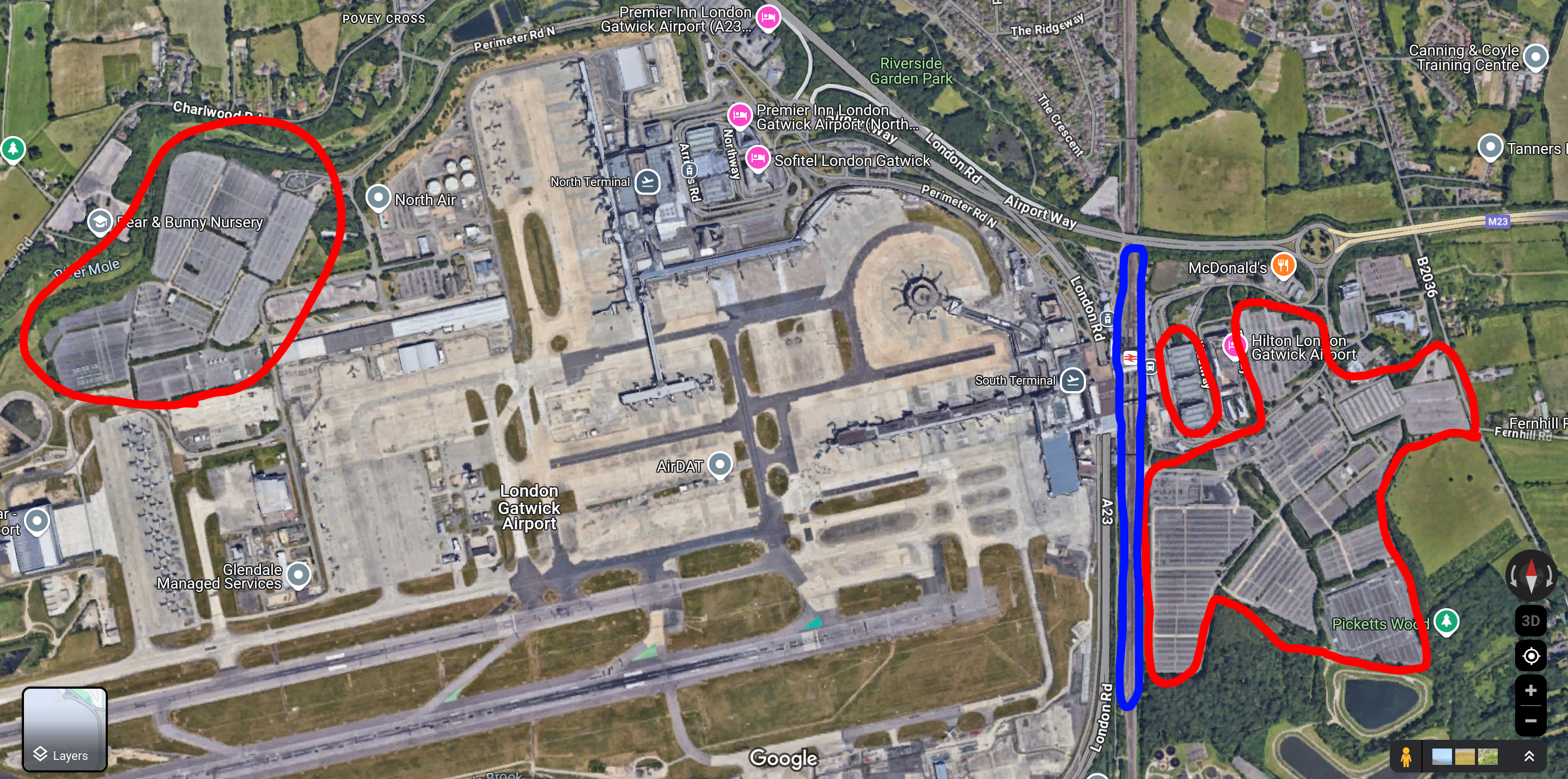 An arial view of London Gatwick Airport. The various car parks (short-stay, long-stay, holiiday parking) are circled in red, and the train line in blue. The train station is located next to the South terminal, whereas the car parks are located further out to the bottom-right and up in the top-left, and take up roughly 10-20x as much space. London Gatwick Airport: red = airport parking, blue = airport train line. Note that there is an airport train service running between the two terminals